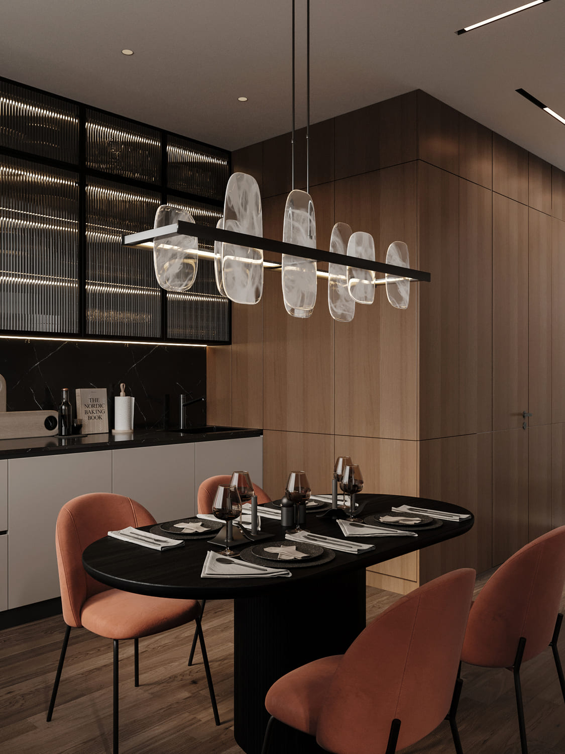 Обеденный стол с выразительной черной столешницей и дизайнерскими стульями приглашает собраться вместе, а эффектная люстра с прозрачными плафонами задает настроение и становится ключевым декоративным акцентом.