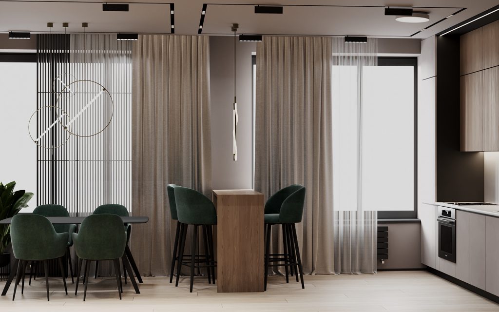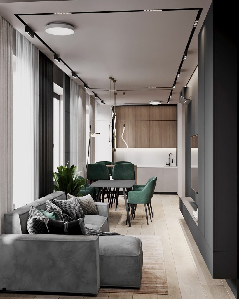Кухня-гостиная — пространство, наполненное воздухом и пронизанное природными мотивами. Характерная для минимализма монохромная основа сочетается здесь с текстурой дерева и изумрудным цветом. Стоит сказать, что мы подчеркнули вытянутое в плане помещение интересными деталями. Например, той же магнитной системой освещения, что и в прихожей — только здесь ее «разбавляют» акцентные подвесы над столом и накладные светильники. Также мы продумали эргономику пространства: в дальней части разместили большой угловой диван, а на противоположной стене, в зоне ТВ, предусмотрели длинную консольную тумбу, завершающуюся закрытым стеллажом.