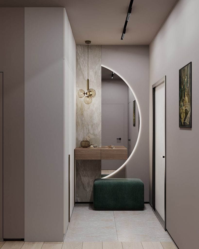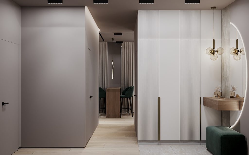Прихожая в кремовых тонах погружает в мягкую лаконичность общего настроения квартиры. А контрастные детали подчеркивают значимость формы: например, встроенная магнитно-трековая система, окантовка входной двери или пуф сложного изумрудного оттенка. Чтобы сделать пространство функциональным, мы разместили в нем удобный консольный столик с большим зеркалом — они вторят принципам внимания к форме. Также предусмотрели вместительный шкаф до потолка с антресольным хранением. К слову, прием зонирования здесь реализован в напольных покрытиях — в зоне прихожей мы предусмотрели отделку керамогранитом с текстурой камня, а в коридоре его сменяет имитация деревянной доски.