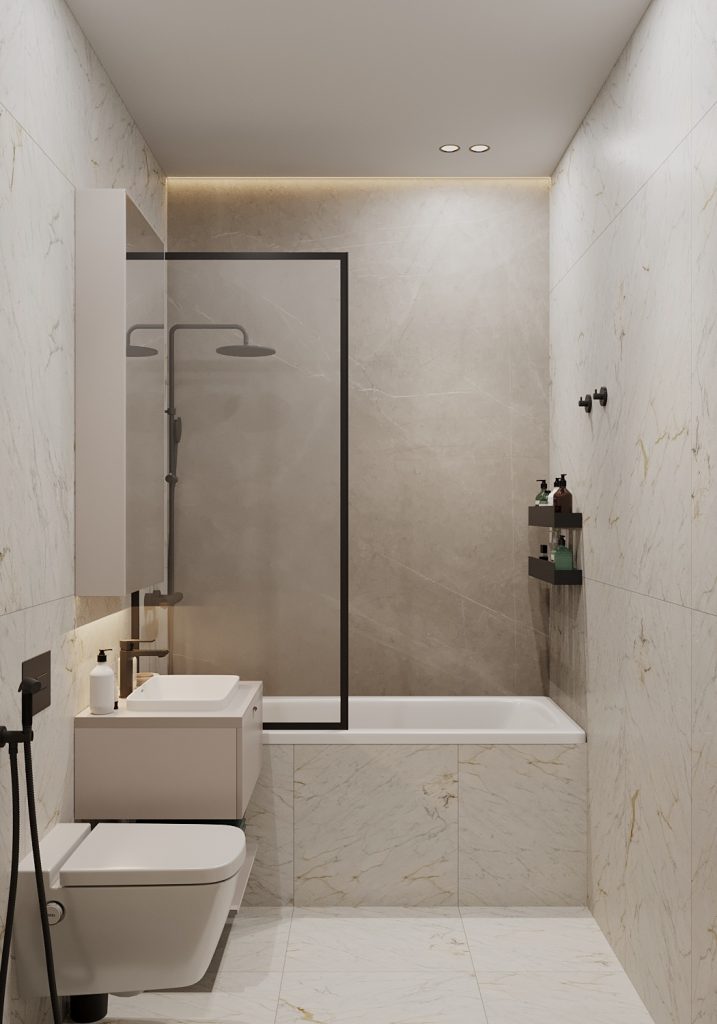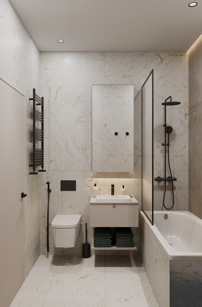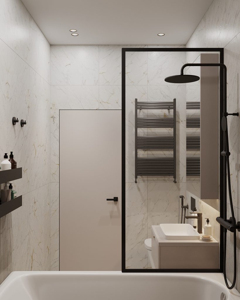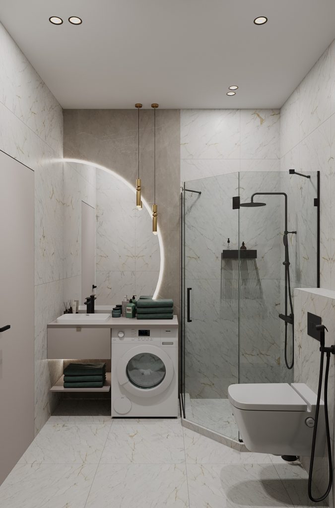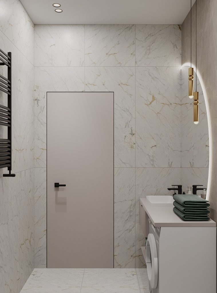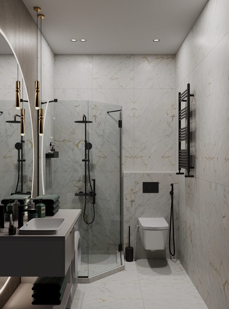 Во втором санузле мы разместили угловую душевую кабину, стиральную машину, а также эстетичное зеркало с дизайнерскими подвесами. Пространство не менее эргономично, чем первая вариация: здесь мы также предусмотрели тумбу для раковины с консольной полкой, контрастный полотенцесушитель и небольшую аккуратную полку в душевой. Ведь минимализм — это не про белые стены, а про функциональность, современность и лаконичность.