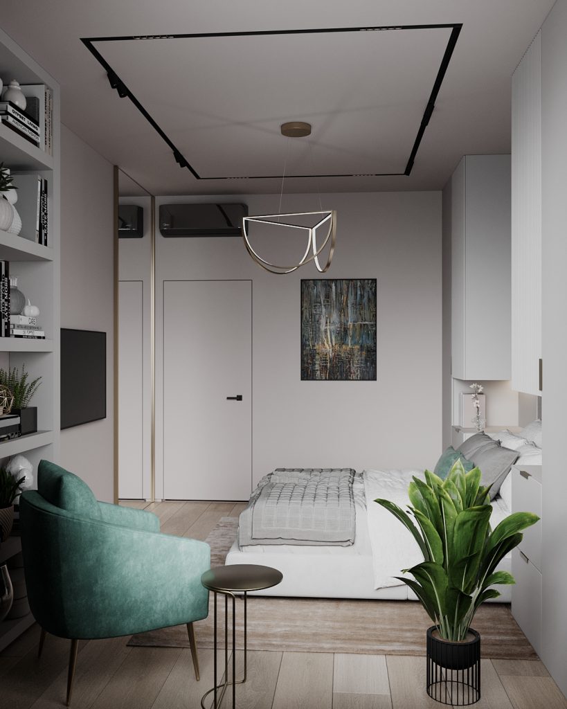 Квартира свободной планировки для семейной пары в мягких светлых оттенках с изумрудными акцентами.
