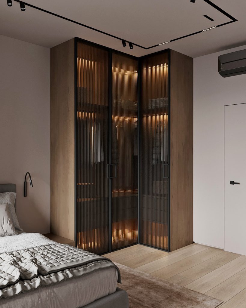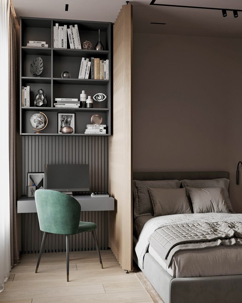 Спальню мужчины отличает не только цветовая гамма. Здесь мы продумали и образ жизни заказчика. Например, предусмотрели необходимое рабочее место — с эргономичным консольным столом и полками для хранения. И, конечно, разместили высокий гардероб с подсветкой и с дверцами из рифленого стекла — лучшее место для хранения костюмов. Этой вертикали вторит поворотная перегородка, разделяющая рабочее пространство и спальню, а также 3D-панель, которой мы дополнили зону кабинета.