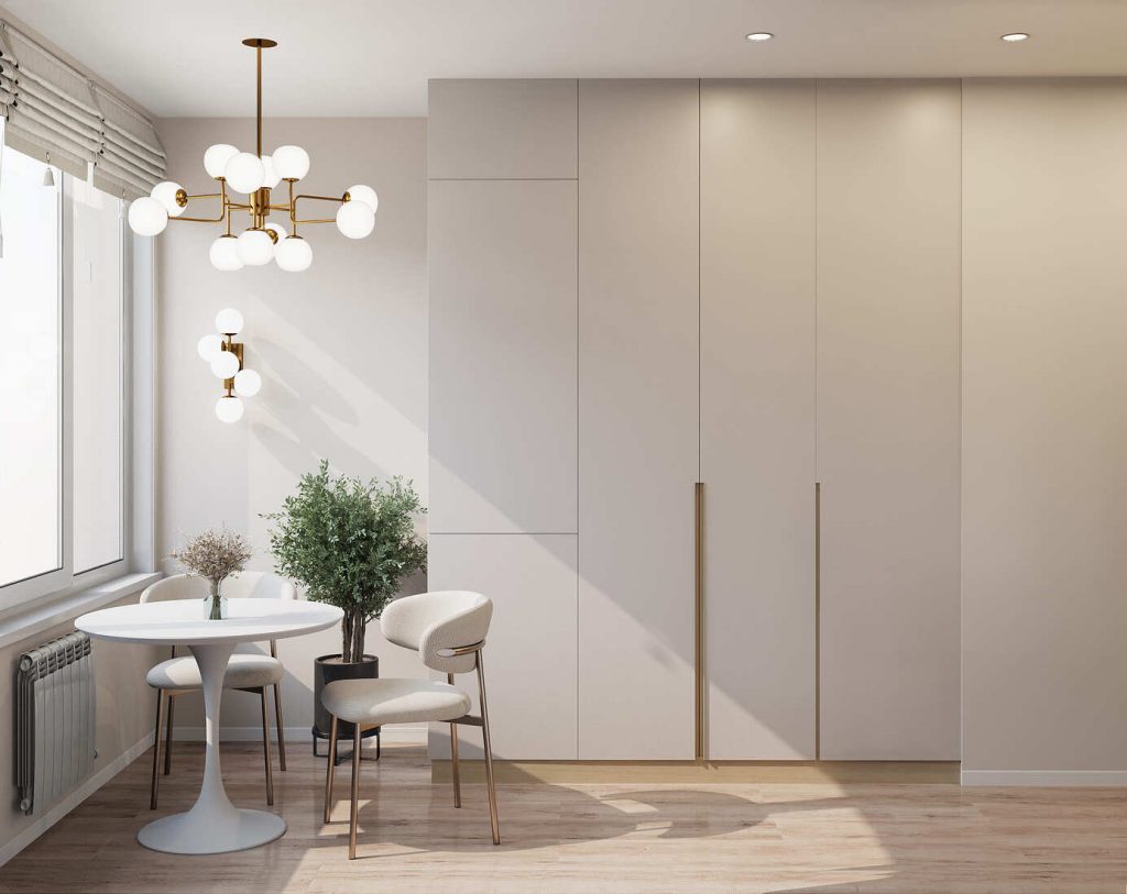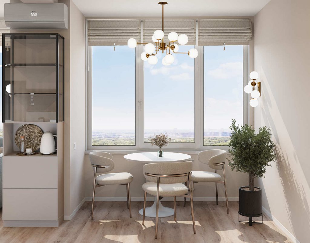 Для визуального расширения пространства мы использовали приёмы игры со светом и отражениями: большие окна без тяжёлых штор, лёгкие римские шторы, светлые стены и тёплый оттенок напольного покрытия. Люстры и бра с белыми шарами и золотистой фурнитурой добавляют нотку элегантности и делают интерьер живым.