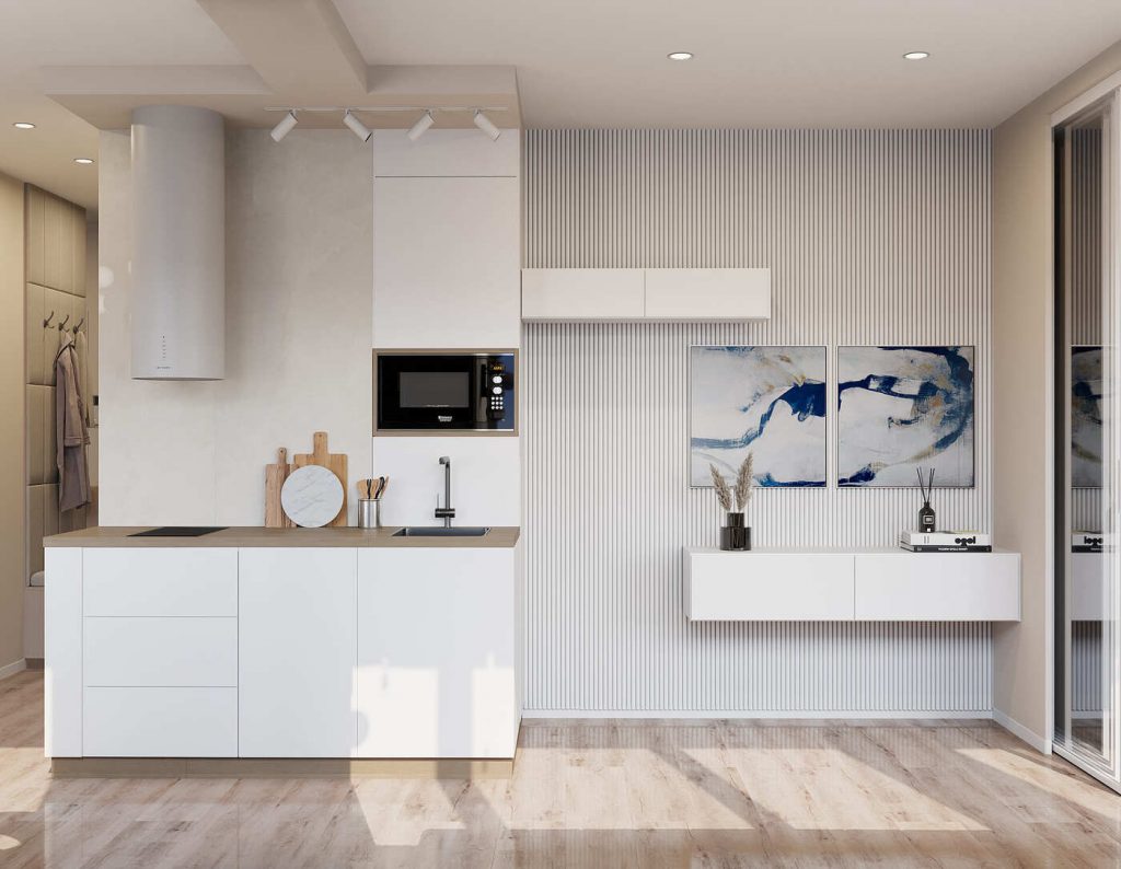 Кухонный гарнитур выполнен в нейтральной цветовой гамме и сведён к минимуму — всё необходимое уместилось в один компактный блок. В нём есть варочная панель, мойка, встроенная микроволновка и шкафы для хранения. Благодаря вертикальной организации пространства и минимализму в деталях, кухня не перетягивает на себя внимание и визуально сливается со стеной.