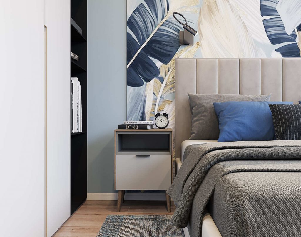 Центральным декоративным элементом этой зоны стало панно с изображением крупных листьев в приглушённой голубой и золотистой гамме. Оно не только задаёт цветовое настроение всей комнате, но и визуально «отделяет» спальню от гостиной. Этот приём помог создать ощущение уединённости без установки капитальных перегородок.