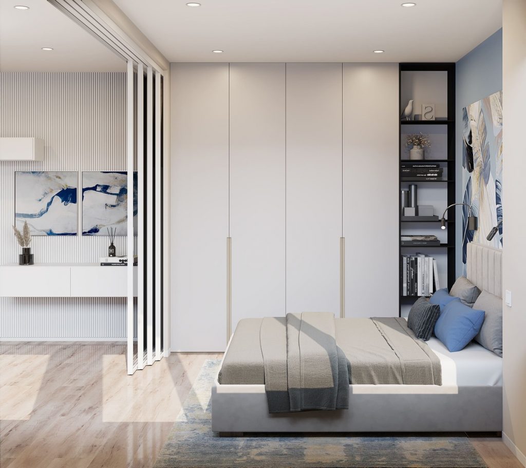По бокам от кровати — открытые стеллажи, в которых можно разместить книги и мелочи, а также закрытые шкафы до потолка с интегрированными ручками. Это позволяет использовать каждый сантиметр стены по максимуму, не перегружая интерьер.