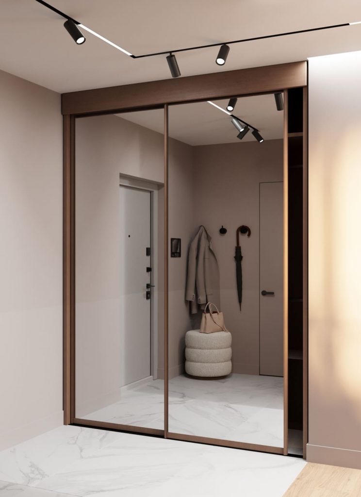 Шкаф-купе с зеркальными фасадами визуально расширяет пространство и поддерживает общий ритм интерьера