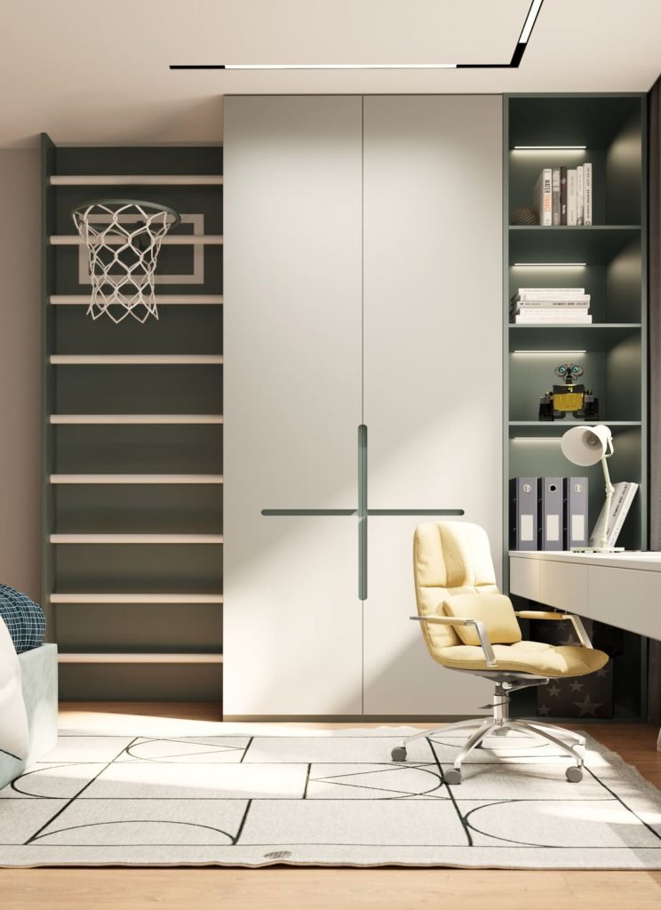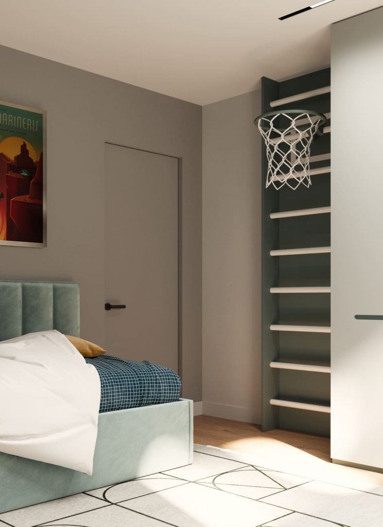 Рабочая зона встроена вдоль окна — здесь полноценный стол, удобное кресло и много света. Встроенные шкафы и открытые полки дают место как для хранения, так и для любимых книг, моделей и конструктора. Правая стена комнаты — неожиданное, но очень удачное решение: шведская стенка с кольцом для баскетбола встроена прямо в стеллажную систему. Такая интеграция зоны активности — находка для детской: не занимает отдельного пространства, но вдохновляет на движение.