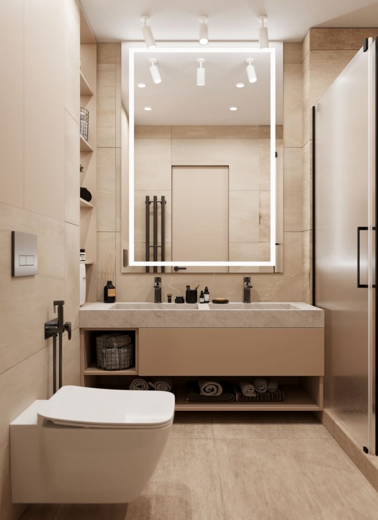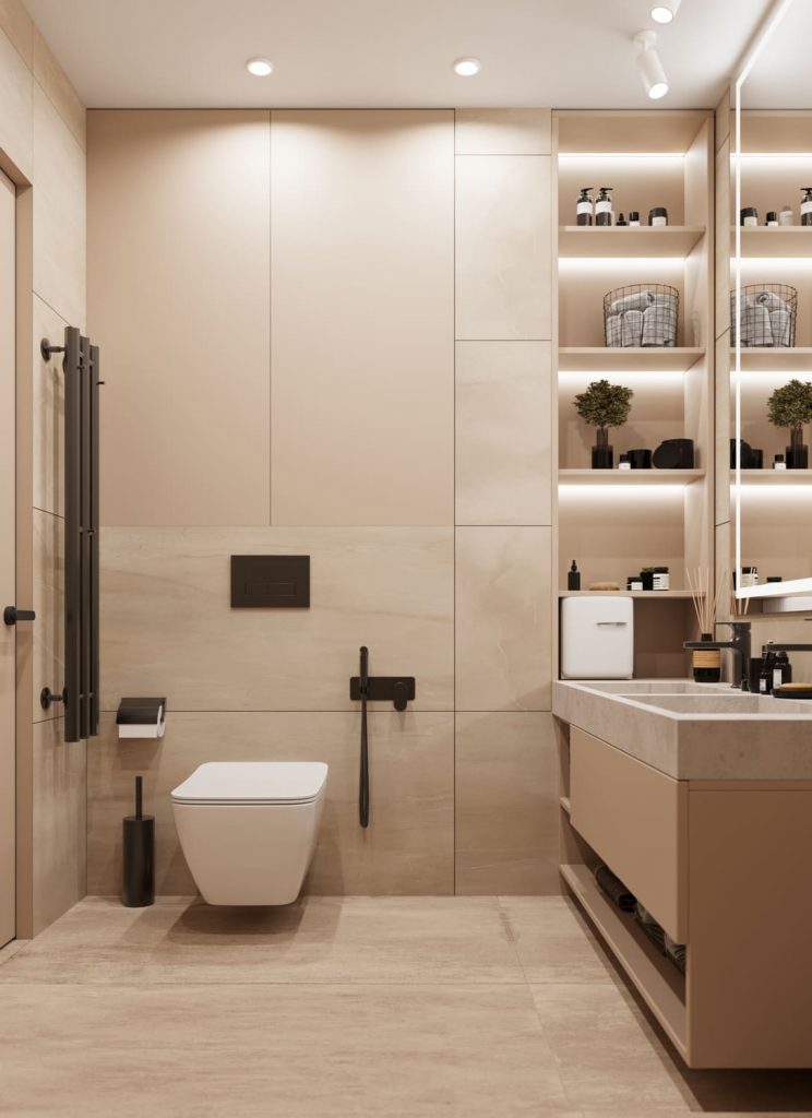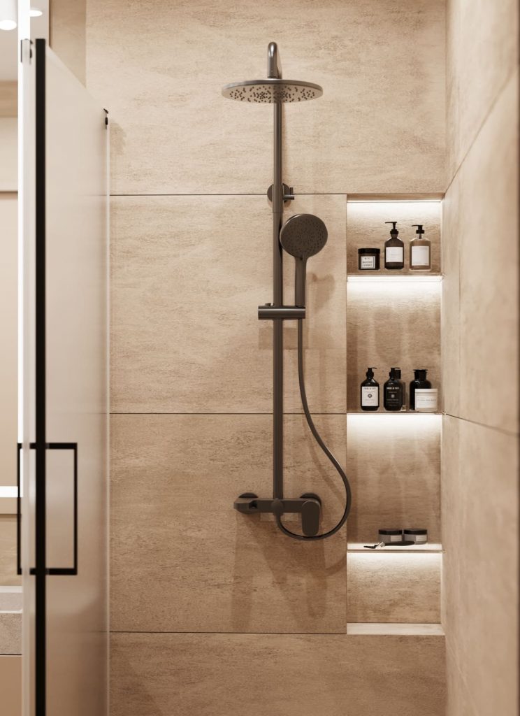 Интерьер выдержан в тёплой нейтральной гамме — мягкий песочный тон плитки сочетается с матовой фурнитурой чёрного цвета. Зона душа выполнена с верхним и ручным душем, встроенным смесителем и скрытым трапом. В стене предусмотрены ниши с подсветкой для хранения банной косметики. Унитаз — подвесной, с гигиеническим душем и минималистичной кнопкой смыва.