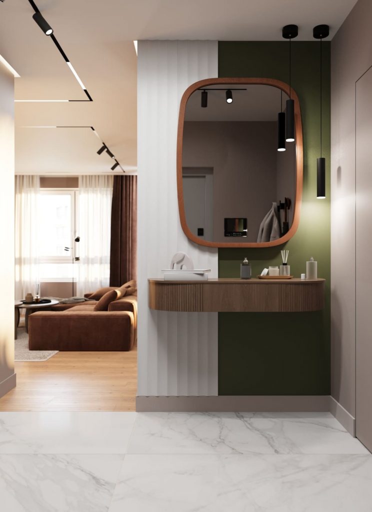 Отдельного внимания заслуживает зона с зеркалом: его органичная форма и деревянная рамка добавляют уюта, а контрастный оливковый фон и вертикальные панели делают композицию объёмной и живой. Над консолью — подвесной свет: точечный, мягкий, тёплый.