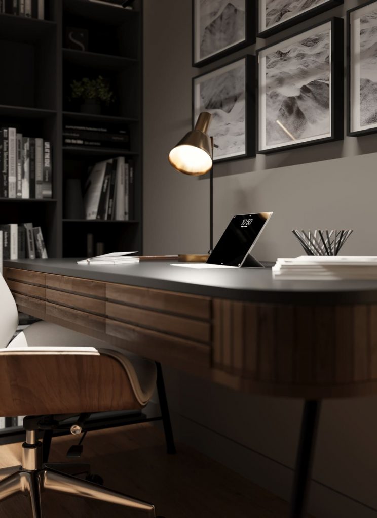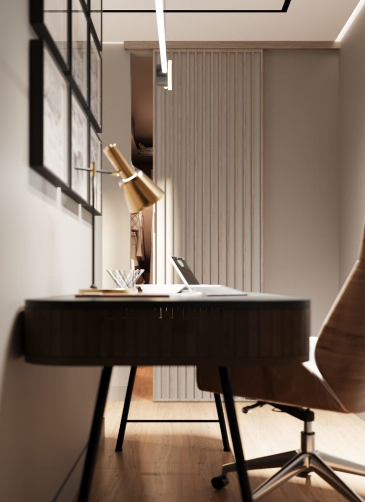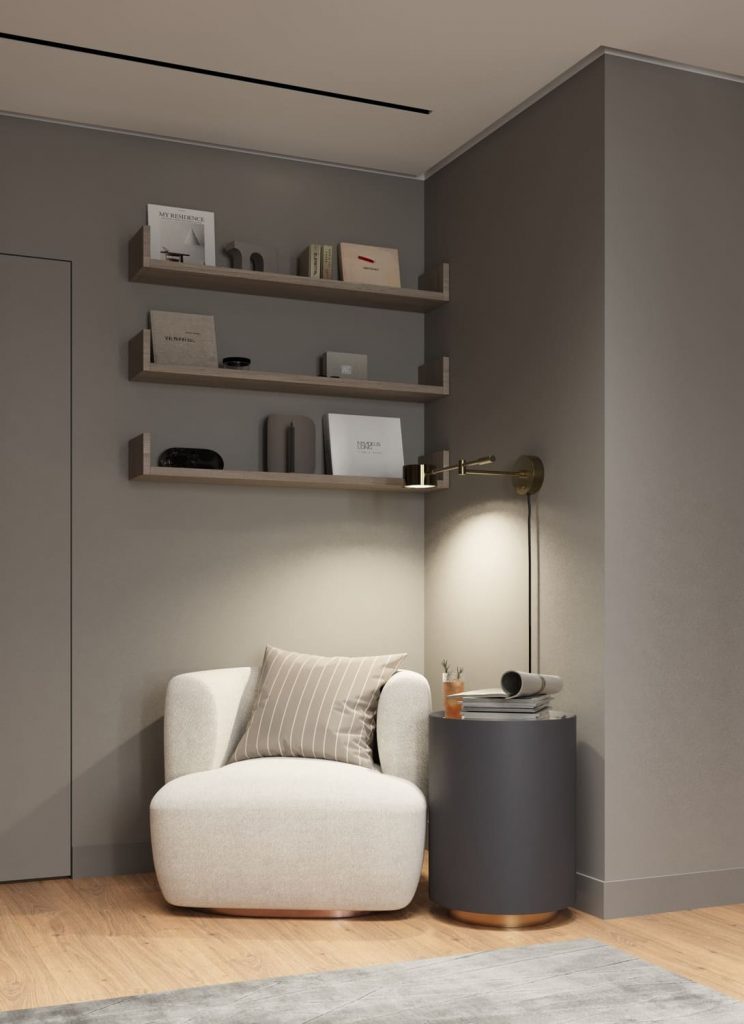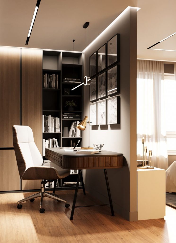 В углу — уютный уголок для чтения с креслом и настенным светильником, а за перегородкой — полноценная рабочая зона с тёмной библиотекой, арт-постерами и лаконичным столом. Интерьер кабинета перекликается с остальной квартирой, но звучит чуть строже — как и должно быть в личной зоне взрослого человека.