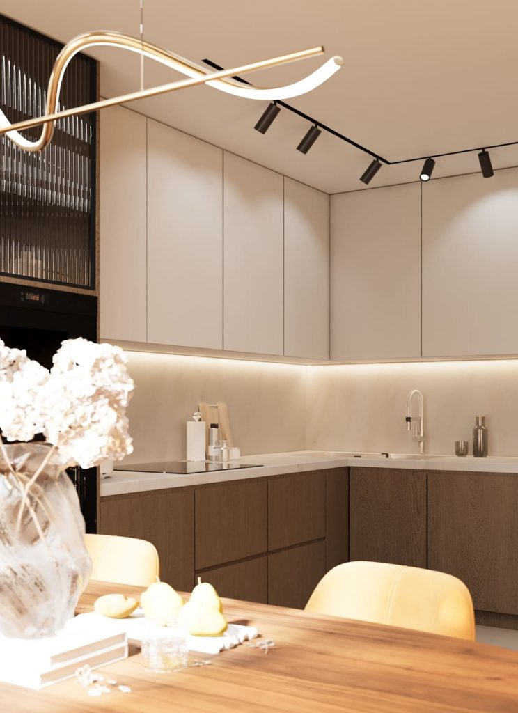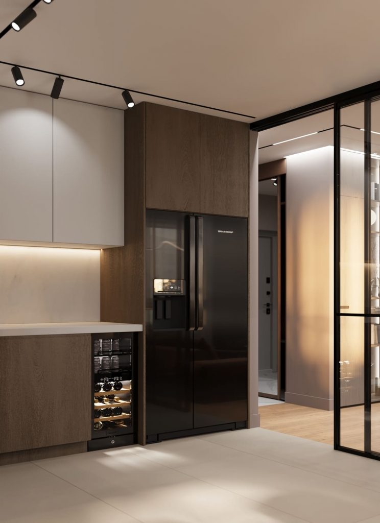 Рабочая зона кухни выполнена в минималистичном стиле, с чёткими геометриями, но без холода. Подсветка по периметру создает ощущение «парящего» гарнитура, а встроенная техника, винный шкаф и вместительный холодильник дополняют функциональность.