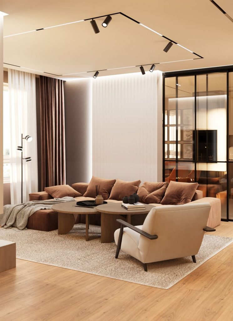Низкий объемный диван цвета какао задаёт ритм всей зоне отдыха, а мягкий текстиль и ковёр приглушают звуки и создают атмосферу уединения.
