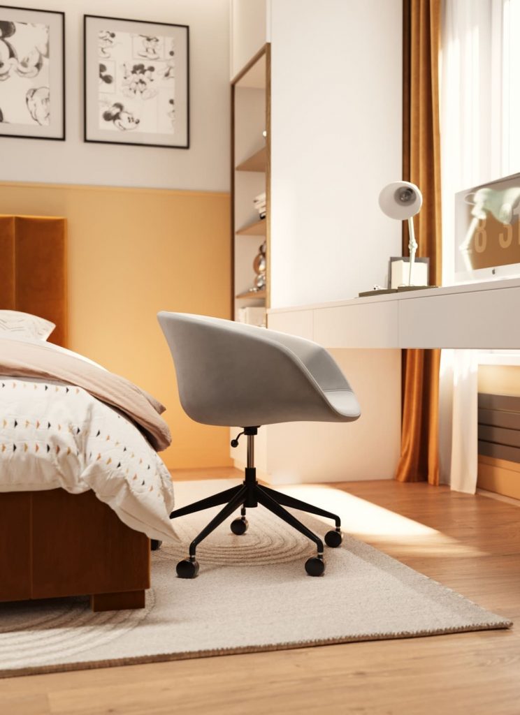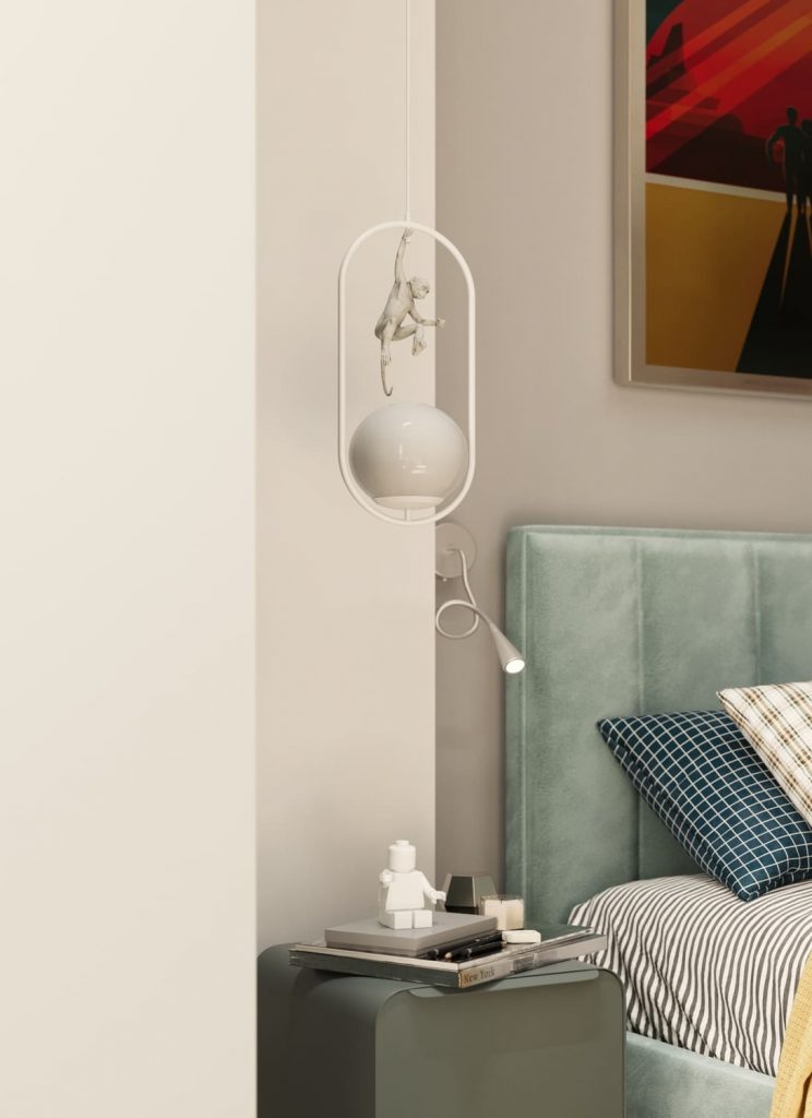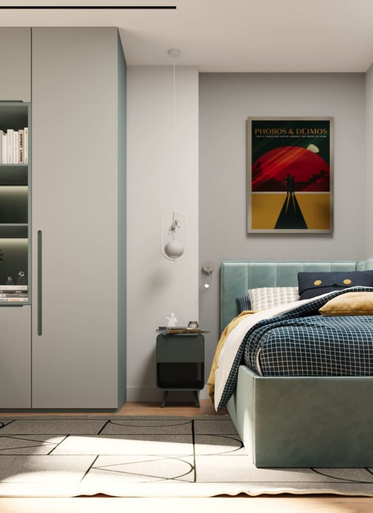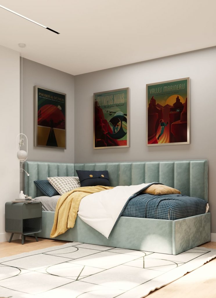 Мягкое изголовье кровати выполнено из бархатистой ткани оттенка шалфея, а строгие вертикальные линии придают композиции графичность. Текстиль на кровати подобран сдержанно, но не скучно: тёмно-синяя клетка и жёлтый плед освежают общий образ. Над кроватью — три винтажных постера с темой освоения Марса, которые легко заменить на другие, если интересы юного жителя изменятся.