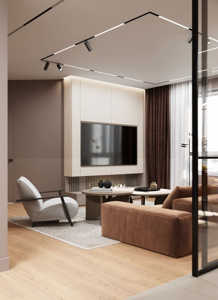 Свет — ещё один герой этой комнаты: графичные трековые светильники и тёплая светодиодная подсветка создают разные сценарии — от вечернего кино до мягкого рассеянного освещения для чтения.