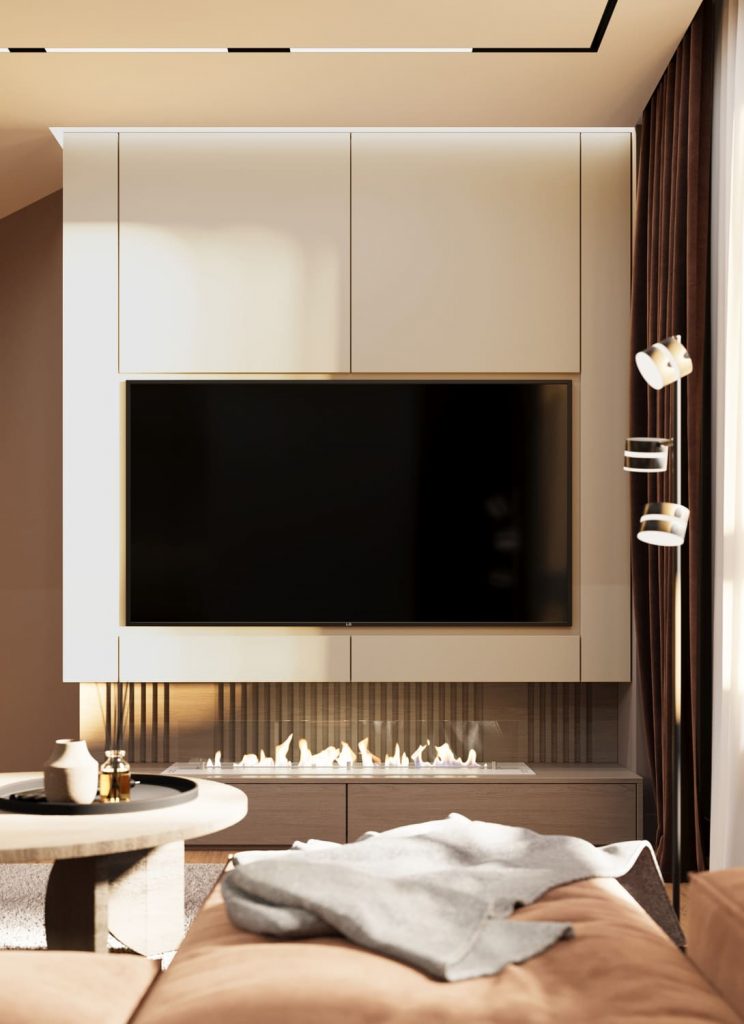 Фокус внимания — ТВ-зона с декоративным биокамином: пламя, отражающееся в глянцевых поверхностях, добавляет интерьеру жизни и уюта. Панель с ТВ — встроенная, с аккуратной подсветкой и вертикальными ламелями, которые поддерживают общий ритм эко-минимализма.