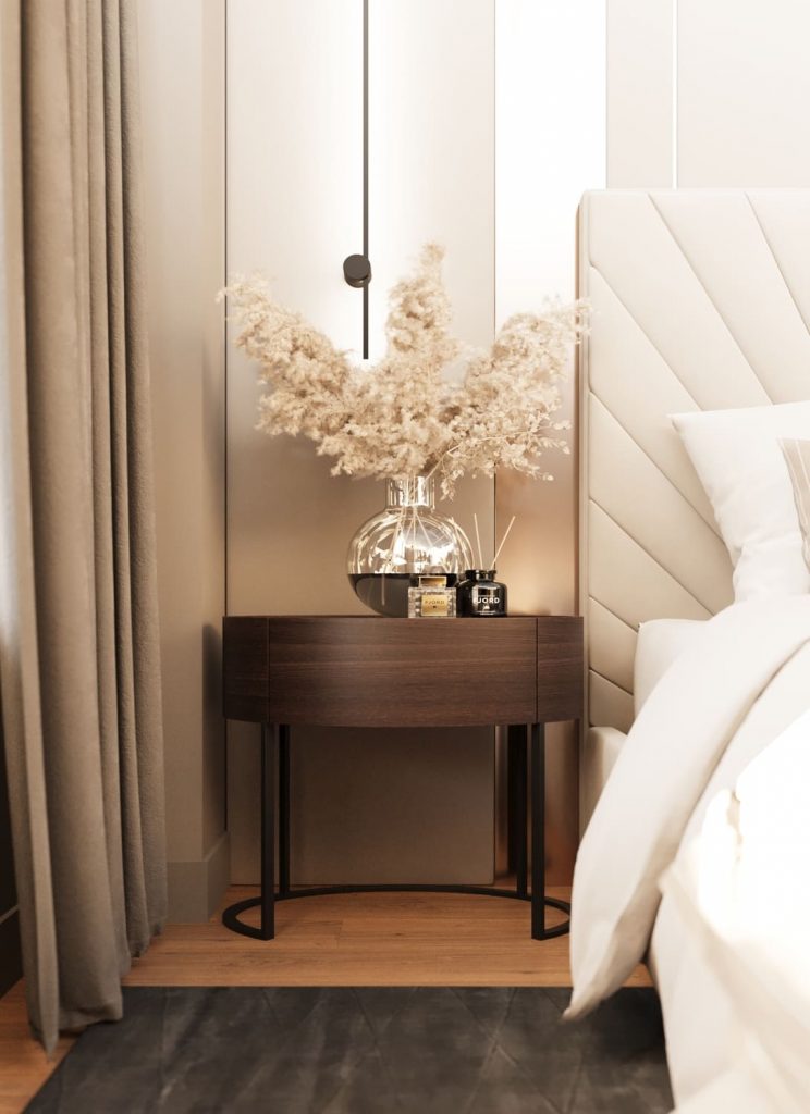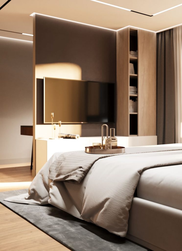 Цветовая палитра выдержана в тёплых серо-бежевых тонах с оттенком шампанского. Мягкое текстильное покрывало, спокойный ковёр, приглушённый свет — всё работает на один эффект: успокоение и расслабление.