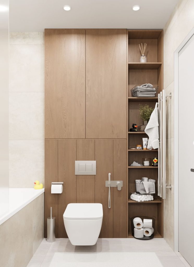 Светлая плитка с мягкой текстурой камня визуально расширяет помещение, а теплые деревянные панели добавляют уюта — особенно в зоне над инсталляцией, где спрятано скрытое хранение.