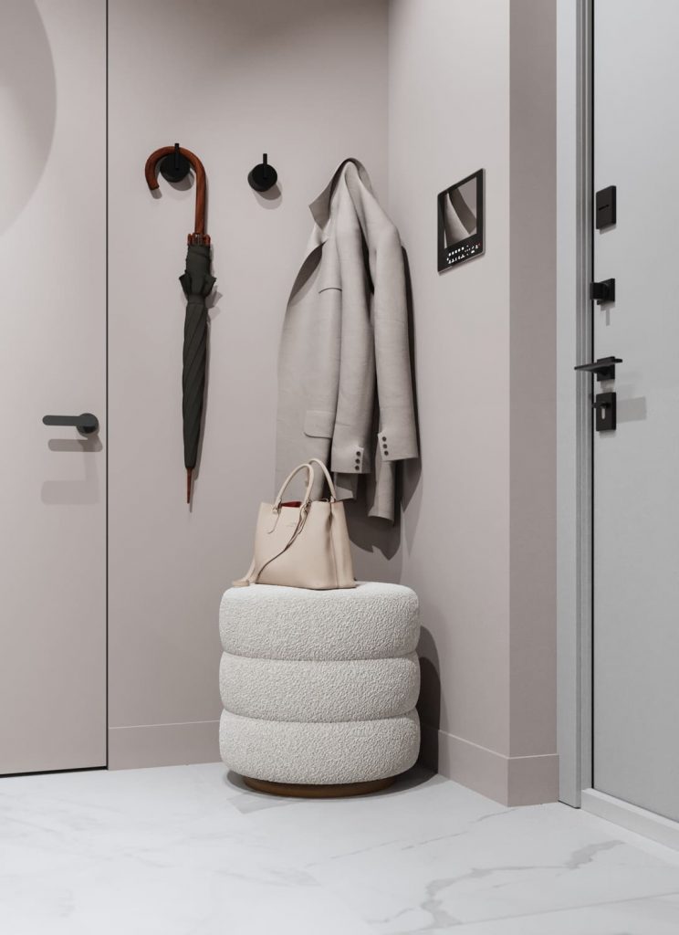 Прихожая встречает мягкими, не кричащими оттенками и аккуратной композицией. Стены в теплых серо-бежевых тонах, мраморная плитка с лёгким рисунком и комфортный мягкий пуф создают ощущение порядка и уюта.