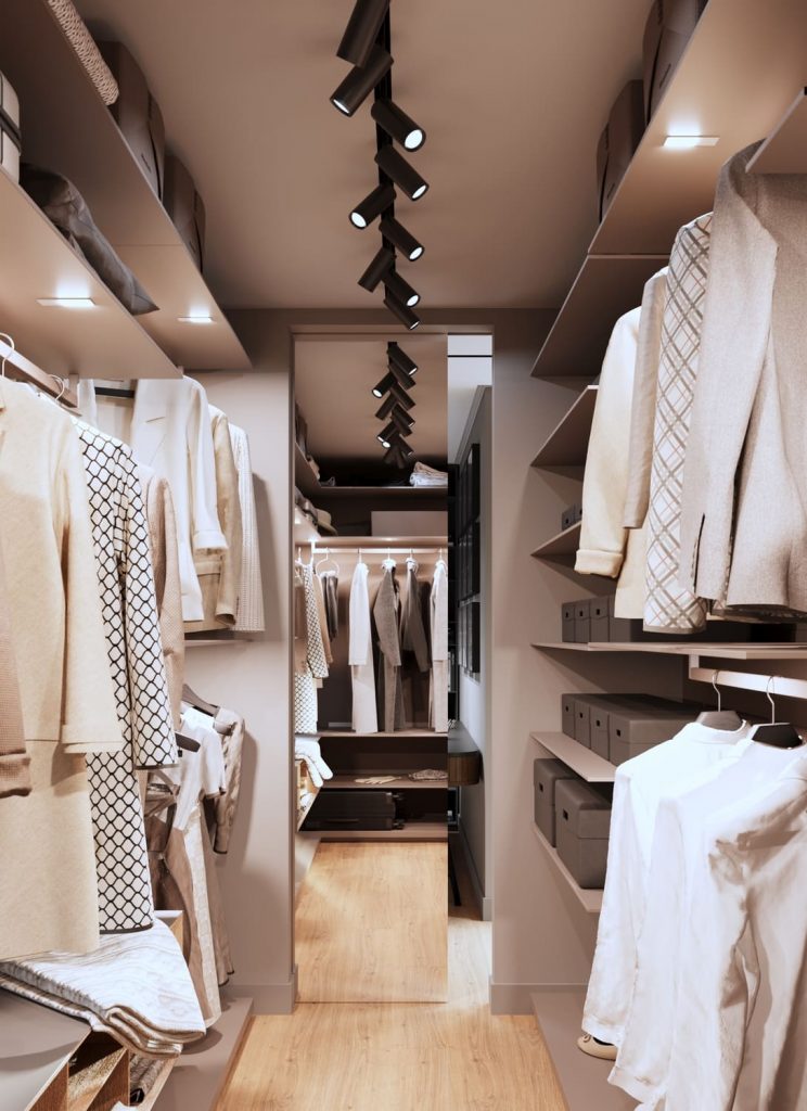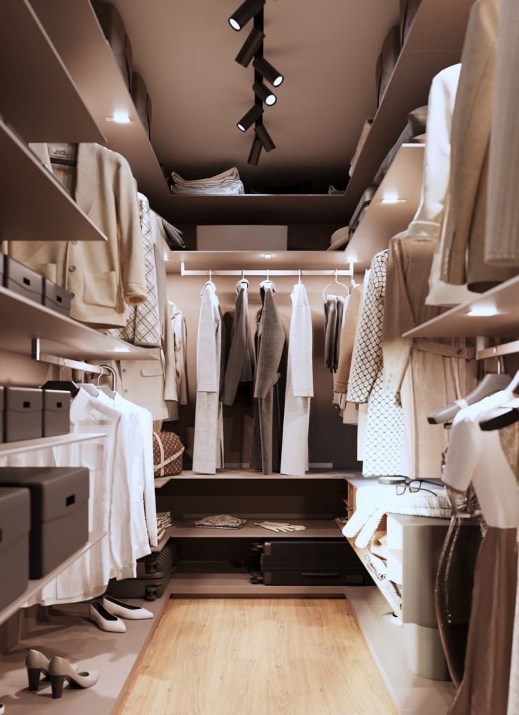Отдельное внимание — гардеробной. Это полноценная система хранения с зеркалом, подсветкой, высоким потолком и продуманной эргономикой. Всё на своих местах — от верхней одежды до обуви, аксессуаров и чемоданов.