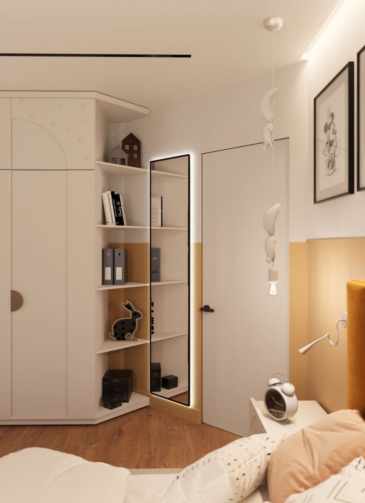 Отдельного внимания заслуживает встроенный шкаф с арочными фасадами и объёмным декором — он выглядит сказочно, но при этом остаётся функциональным. Напольное зеркало с подсветкой и игрушки на полках создают ощущение уюта и завершённости.