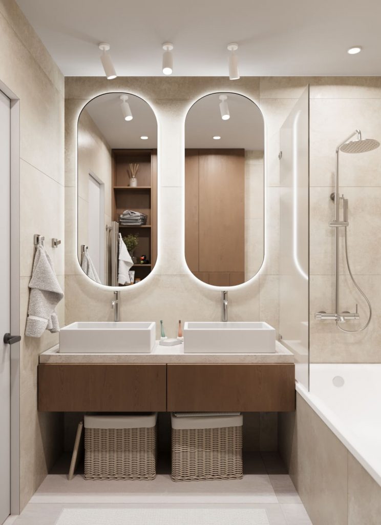Главный акцент — на зоне умывальников. Два овальных зеркала с мягкой подсветкой «погружаются» в арочные ниши, словно архитектурные элементы. Чёткая симметрия раковин и ящиков создаёт ощущение порядка, а плетёные корзины внизу поддерживают визуальный ритм и добавляют текстуры.
