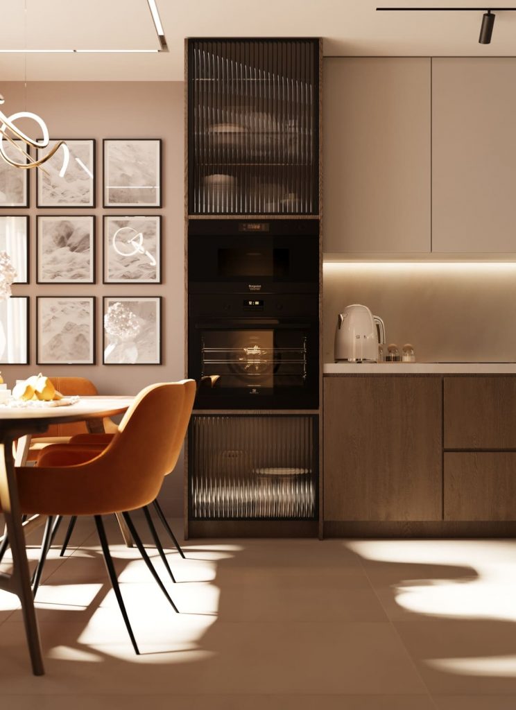 На фоне — стена с серией арт-постеров и высокие витражные фасады, скрывающие технику и посуду. Такая композиция делает интерьер живым, но при этом не перегруженным.