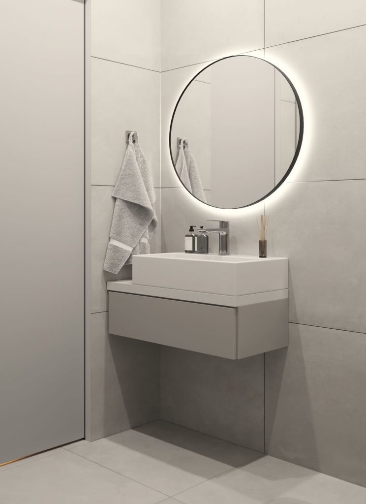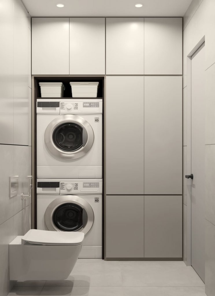 Функциональное пространство, совмещающее гостевой санузел и постирочную. Интерьер выполнен в светло-серой гамме с минималистичной мебелью и ровными матовыми фасадами без ручек. Стиральная и сушильная машины установлены в нишу друг над другом, над ними — корзины для хранения. Рядом — встроенные шкафы до потолка, скрывающие зону хранения бытовой химии, гладильной доски и других принадлежностей. Подвесной унитаз с гигиеническим душем органично вписан в интерьер. Компактная раковина с круглым зеркалом и подсветкой завершает композицию.
