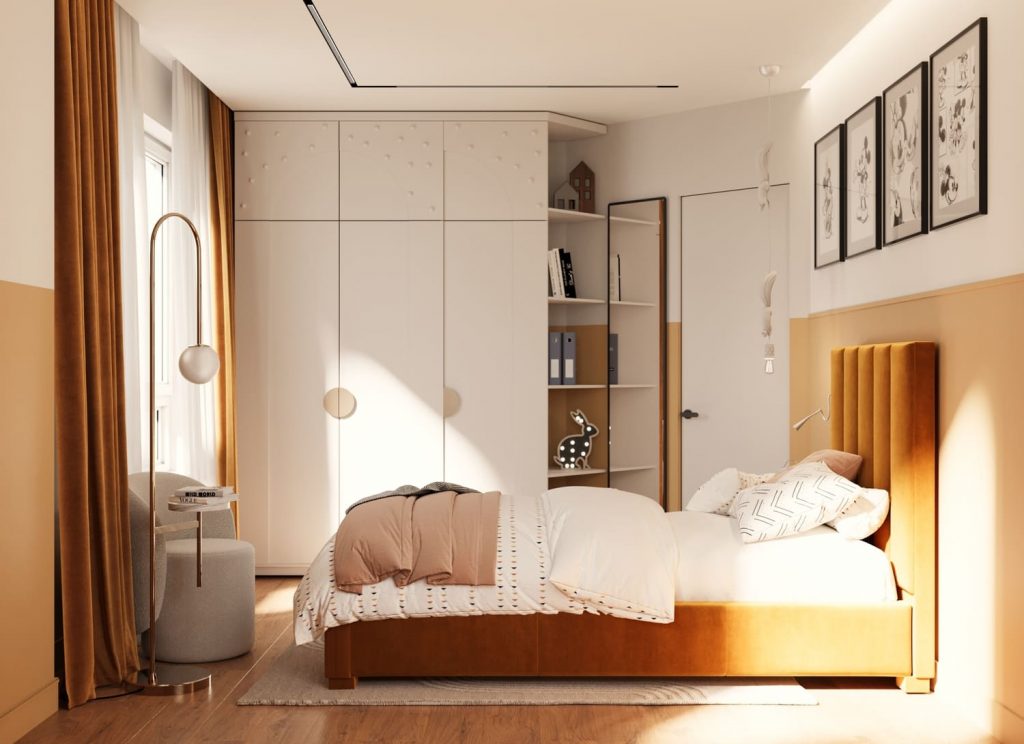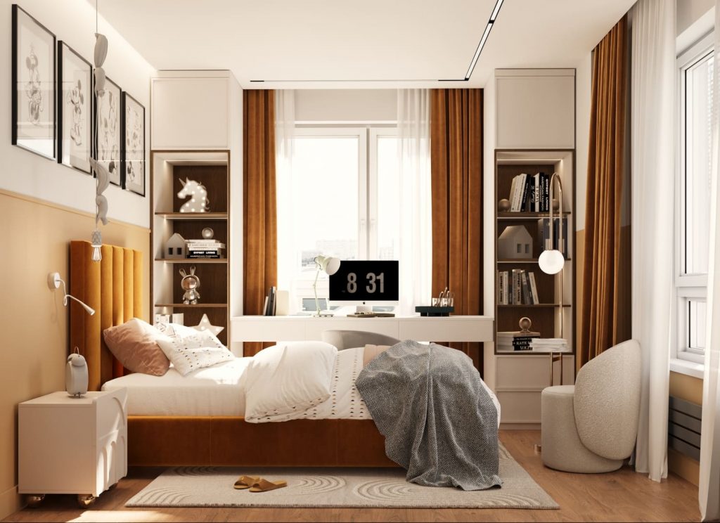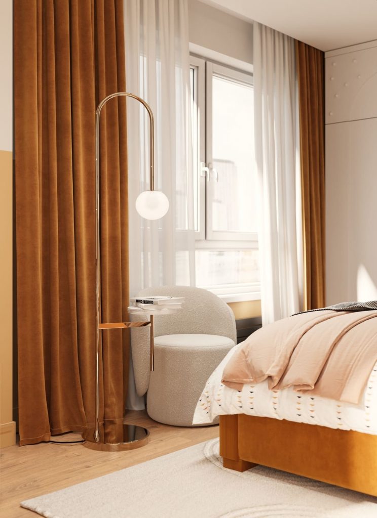 Изголовье кровати выполнено из мягкого бархата с вертикальной стёжкой — визуально простое, но очень уютное и тактильное. Окно оформлено двойными шторами: лёгкий тюль и плотные бархатные портьеры создают глубину и дают возможность регулировать свет в течение дня.