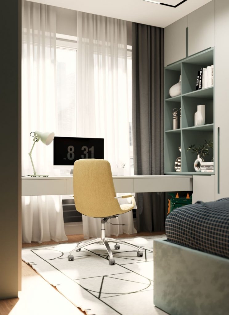 Интерьер выстроен в прохладной палитре мятно-серых и графитовых оттенков с акцентами горчично-жёлтого.