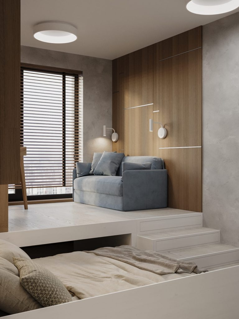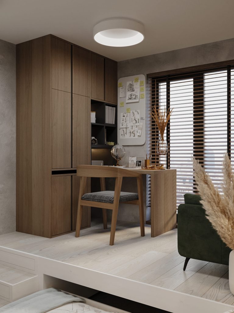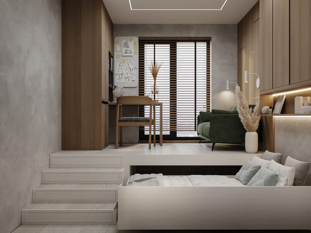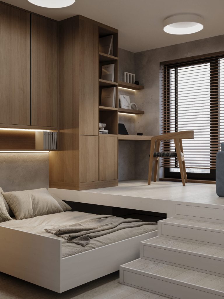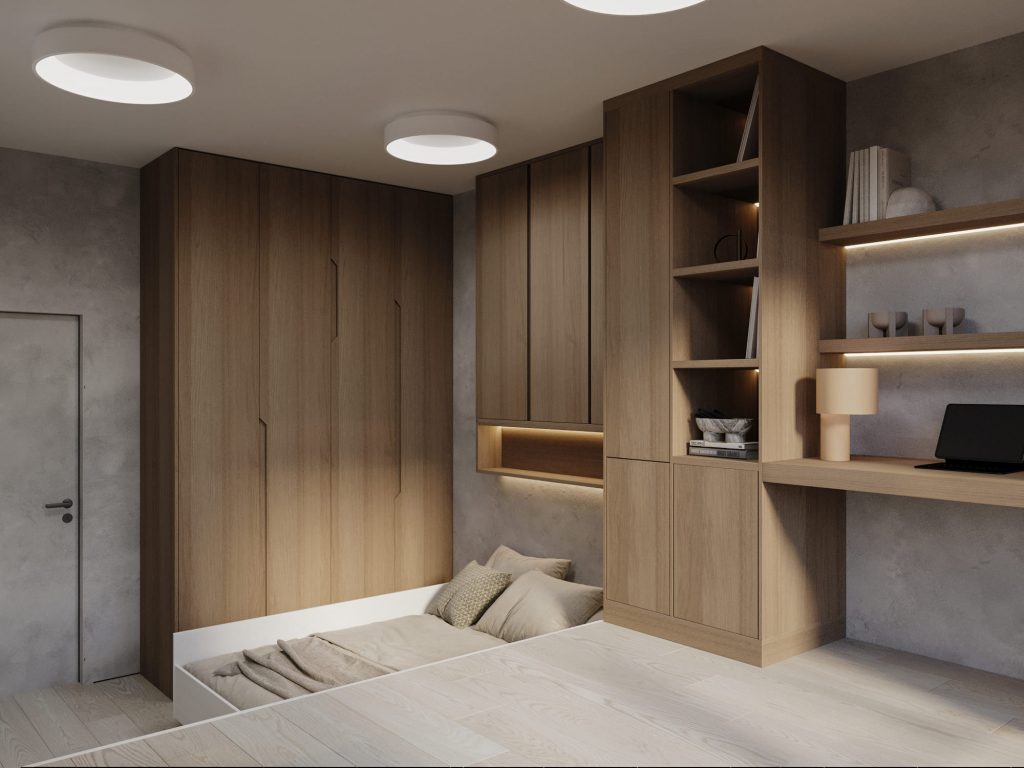 Третья детская комната для второго 17-летнего сына-двойняшки выполнена в аналогичном современном минималистичном стиле, с продуманной функциональностью и уютной атмосферой. Центральным элементом является многофункциональный подиум, где расположена выкатная кровать, обеспечивающая экономию пространства и зону для сна. На подиуме организована рабочая зона с письменным столом и стеллажами для учебных принадлежностей и декора. Интегрированная подсветка полок добавляет практичности и создает мягкое освещение для учебы.