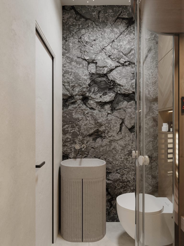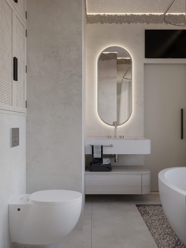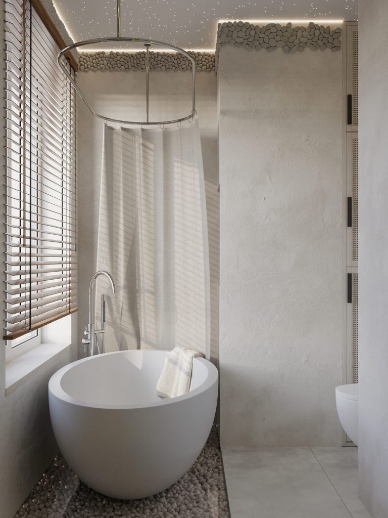 Ванная комната выполнена в минималистичном стиле с природными акцентами, создавая атмосферу спокойствия и релаксации. Центральным элементом является стильная овальная ванна, установленная на покрытии из гладкой гальки, что добавляет текстурности и усиливает ощущение естественности. Пол и стены оформлены светлой декоративной штукатуркой, гармонично сочетающейся с натуральными материалами.