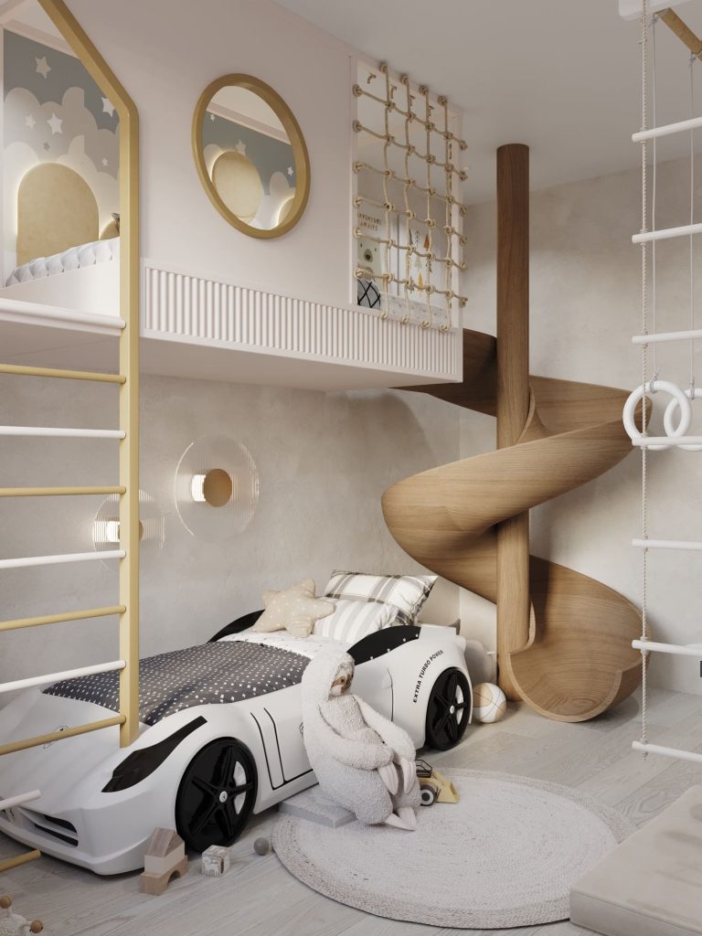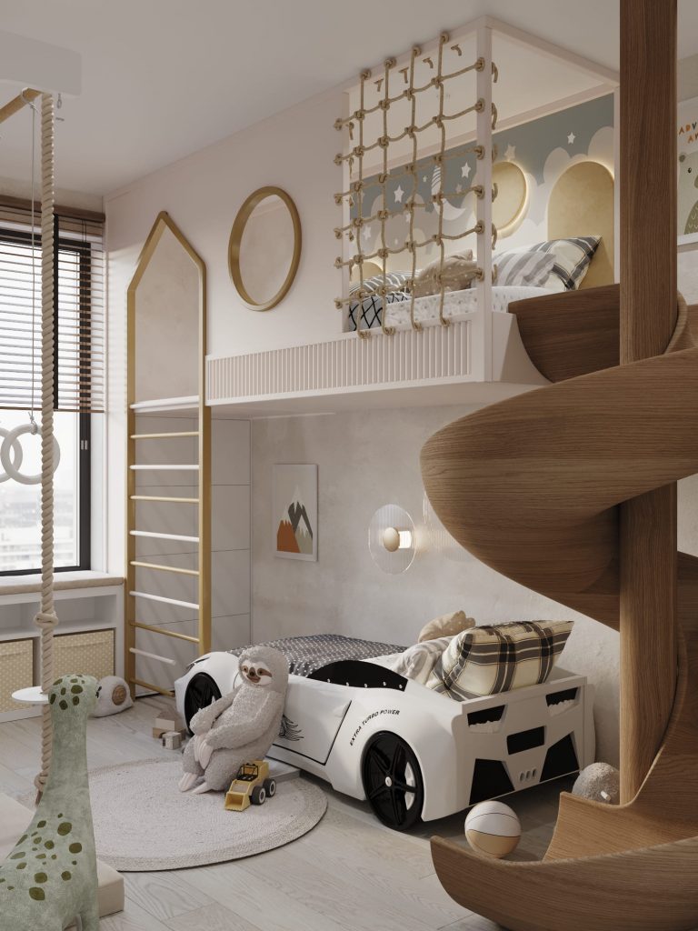 Центральное место занимает кровать в форме автомобиля, что делает комнату особенно привлекательной для малыша и поддерживает игровую тематику. Над кроватью расположена вторая ярусная зона с ограждением из веревочной сетки, куда можно забраться по лестнице. Эта зона дополнена декоративными элементами в виде звезд и облаков, создающими сказочную атмосферу.