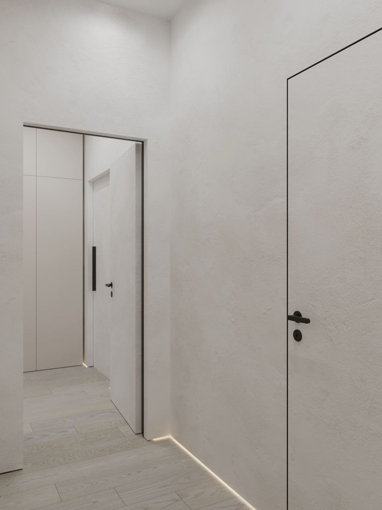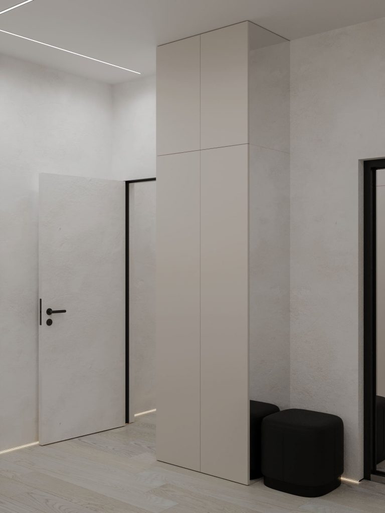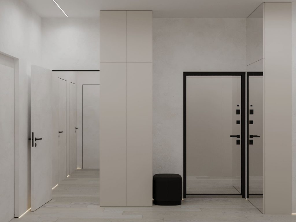 Прихожая четырехкомнатной квартиры для семьи из пяти человек оформлена в современном минималистичном стиле, сочетающем функциональность и эстетичность. Светлые стены с текстурой декоративной штукатурки и полы из натурального дерева создают ощущение простора и уюта. Пространство организовано максимально рационально: встроенные шкафы с гладкими фасадами в цвете слоновой кости обеспечивают достаточное место для хранения, а зеркальные панели визуально расширяют помещение. Контрастные черные акценты, такие как дверные ручки и обрамления, добавляют интерьеру современный характер. Мягкое освещение создает комфортную атмосферу, а черный пуф добавляет функциональности и завершает композицию. Дизайн идеально адаптирован для нужд большой семьи, обеспечивая порядок и стильное первое впечатление.