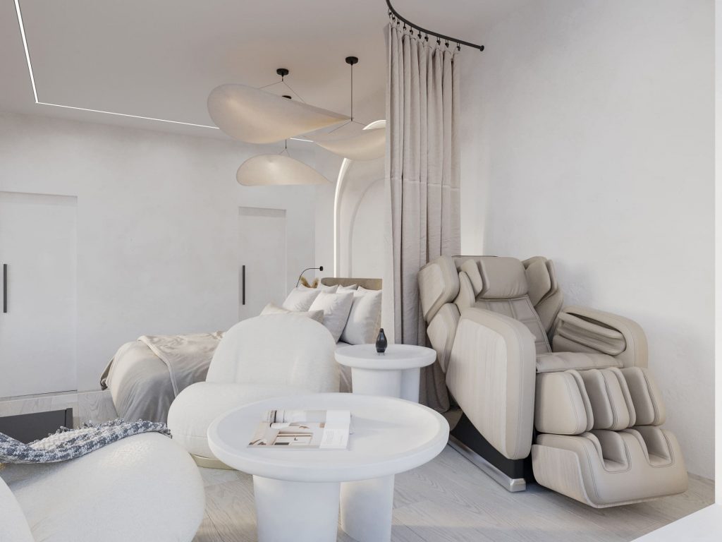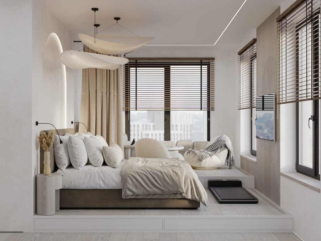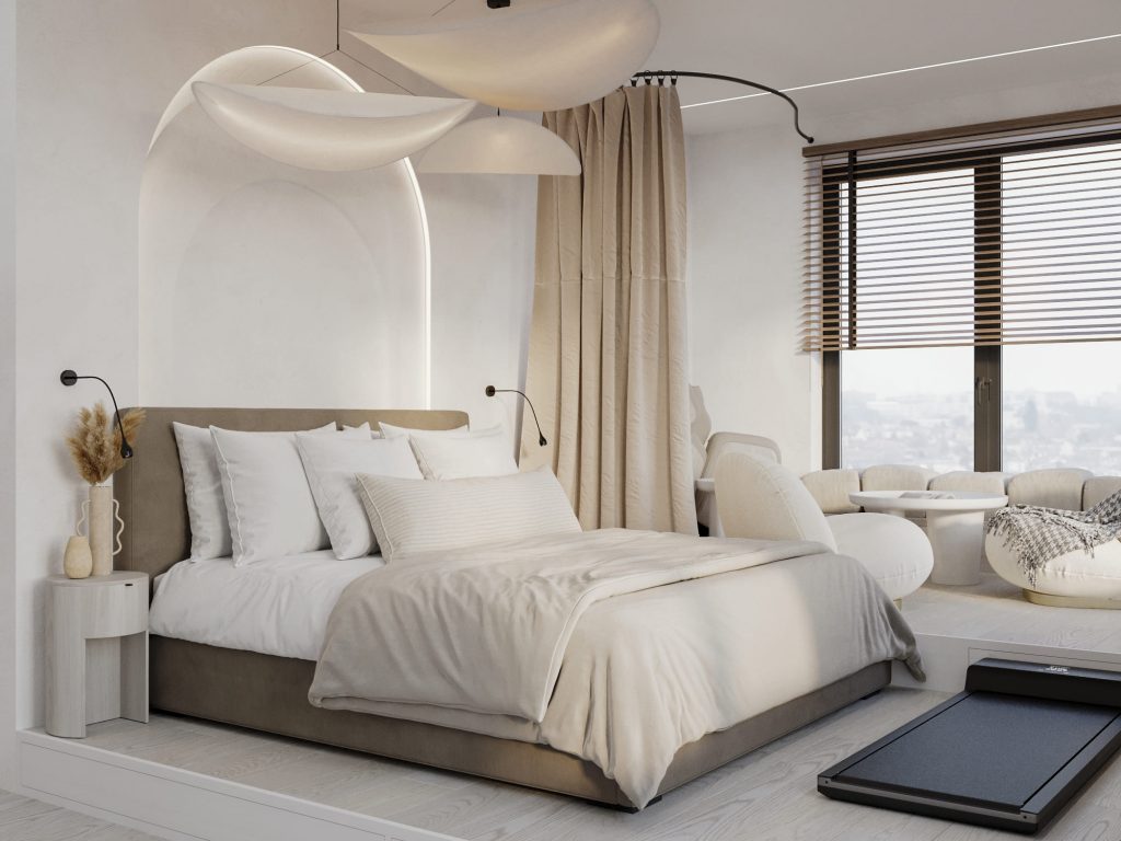 Спальня родителей выполнена в светлых тонах с акцентом на комфорт и спокойствие, что идеально подходит для зоны отдыха. Центр комнаты занимает мягкая кровать с текстильным изголовьем, подчеркнутая декоративной нишей с подсветкой, создающей атмосферу уюта. Над кроватью расположены легкие подвесные светильники, напоминающие облака, что добавляет пространству воздушности и визуальной легкости. Зона отдыха у окна оформлена подиумом, где размещено массажное кресло и небольшой кофейный столик, создающие отдельное место для релаксации.