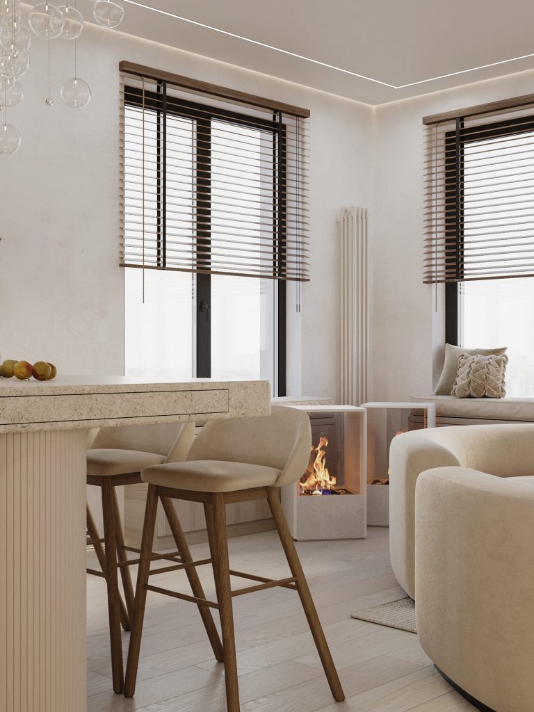 Кухня-гостиная выполнена в современном светлом стиле с нотками японской эстетики, создающими уютное и функциональное пространство для всей семьи. Интерьер оформлен в нейтральной цветовой гамме с использованием натуральных материалов, таких как инженерная доска на полу. Гостиная зона с округлыми мягкими диванами и креслами, выполненными в светлых тонах, создает комфортную атмосферу для общения, а встроенный биокамин в центре добавляет уюта и зрительного тепла. Большие окна с деревянными жалюзи обеспечивают естественное освещение и вносят элементы японского стиля, добавляя пространству лаконичности.