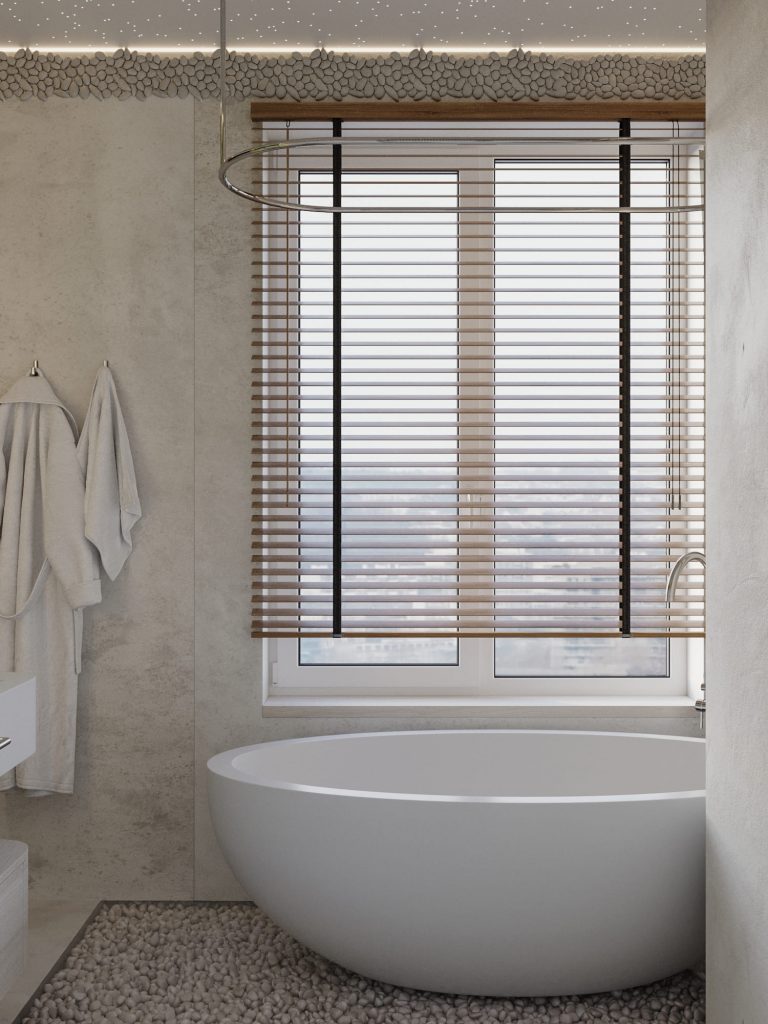 Потолок украшен эффектом «звездного неба» с точечной подсветкой, создающей мягкое и расслабляющее освещение. Вдоль верхней части стен проходит декоративный элемент из мелкой гальки, который добавляет пространству уникальный характер. Большие окна с деревянными жалюзи наполняют ванную комнату естественным светом и подчеркивают ее простор.