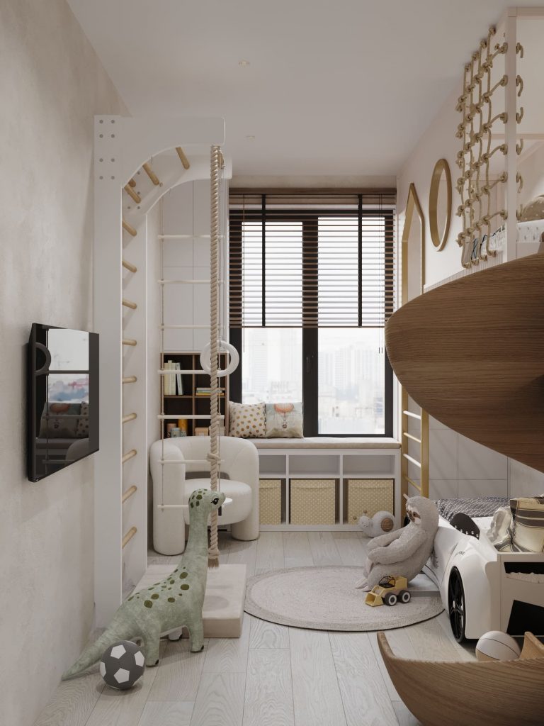 В комнате предусмотрен спортивный уголок с гимнастическими кольцами, канатом и шведской стенкой, что позволяет ребенку активно проводить время, развивая физическую подготовку. Зона хранения организована в виде встроенных ящиков и полок с мягкими корзинами, которые помогают поддерживать порядок. Игровая зона дополнена уютным креслом и мягким ковриком, что делает ее комфортной для чтения и спокойных игр. Большие окна с деревянными жалюзи обеспечивают естественное освещение, а декоративные элементы, такие как наклейки и акценты из дерева, добавляют тепла и уюта интерьеру.