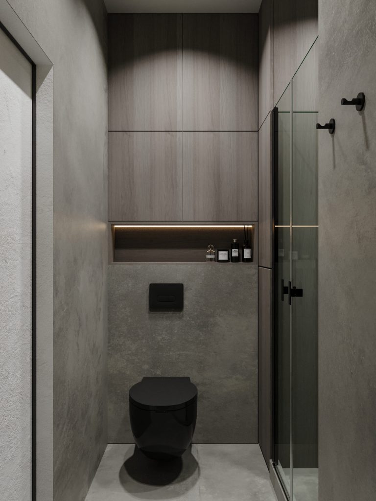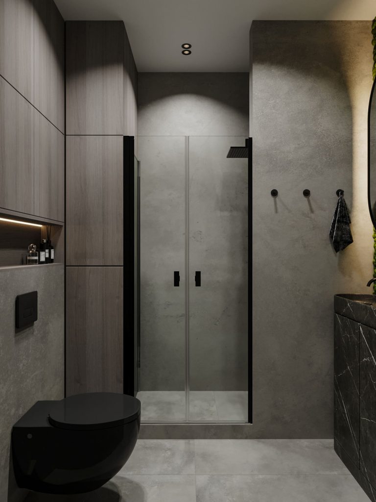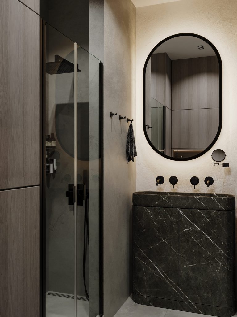 Стены и пол в санузле отделаны под бетон, создавая брутальный и стильный индустриальный эффект. Центральное место занимает черный подвесной унитаз, гармонично сочетающийся с остальными элементами интерьера. Зона душевой отделена прозрачной стеклянной перегородкой с черным профилем, что визуально сохраняет пространство открытым и воздушным. Душевая оснащена черным потолочным тропическим душем и минималистичными черными аксессуарами. Напротив находится умывальник с мраморной текстурой глубокого темного оттенка, который добавляет роскошный акцент в пространство. Над умывальником размещено овальное зеркало с подсветкой, обеспечивающее мягкий и функциональный свет.