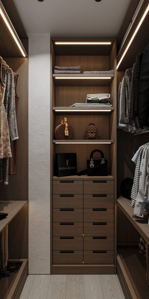 Система хранения в гардеробной тщательно продумана: вместительные открытые полки с интегрированной подсветкой обеспечивают удобный доступ к часто используемым вещам, а ящики с лаконичными черными ручками служат для хранения мелких предметов. Для одежды предусмотрены рейлинги различной высоты, подходящие как для коротких вещей, так и для длинных, что делает пространство универсальным.