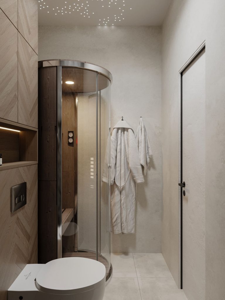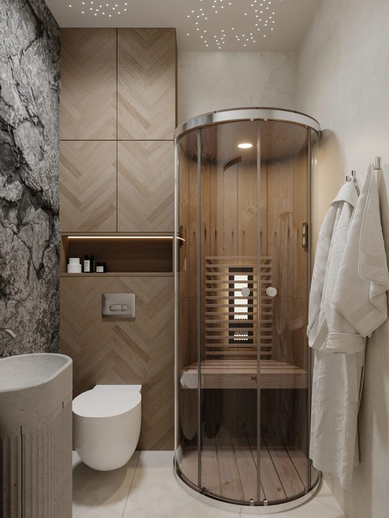 Сауна выполнена в современном стиле с использованием натуральных материалов и текстур, создающих атмосферу релакса и уюта. Центральным элементом является компактная сауна с панорамной стеклянной дверью и внутренней отделкой из натурального дерева, что придает теплоту и делает пространство визуально легким. Стены комнаты сочетают светлую декоративную штукатурку с акцентной поверхностью из грубого камня, добавляющего природный характер и контраст текстур. Потолок украшен эффектом «звездного неба» с точечной подсветкой, создающей расслабляющую и уютную атмосферу. Бетонный умывальник с рельефной фактурой и подвесной унитаз подчеркивают современность и функциональность пространства. Гармоничное сочетание материалов, продуманные детали и уникальное освещение превращают это пространство в идеальное место для отдыха и восстановления.