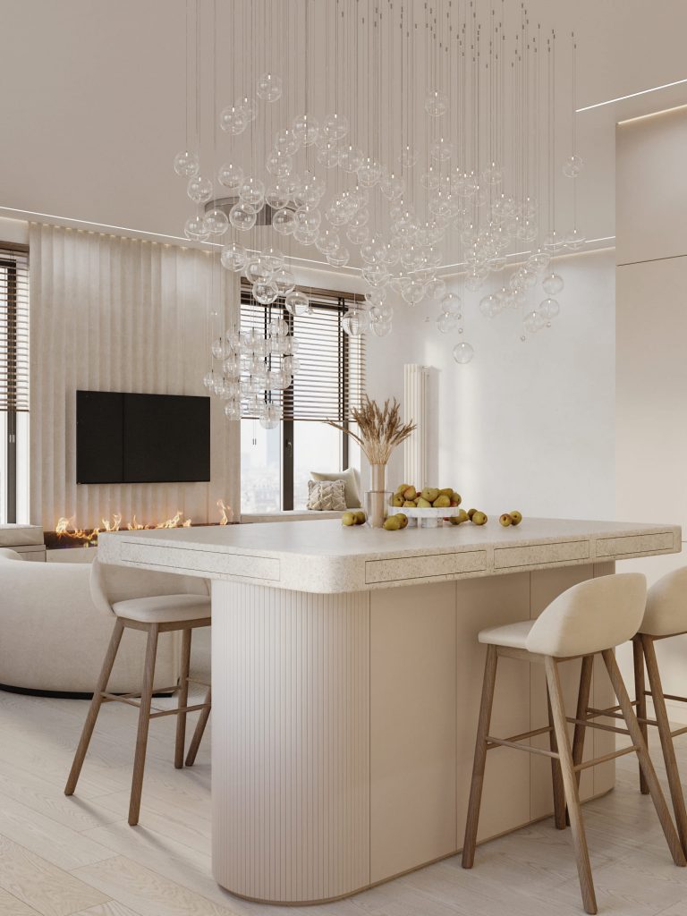 Кухонная зона представлена островом с удобными барными стульями, который идеально подходит для семейных завтраков или приготовления пищи, а встроенные шкафы с минималистичными фасадами сохраняют визуальную чистоту и порядок. Особое внимание привлекают подвесные светильники из стеклянных шаров, создающие эффект воздушности и играющие роль декоративного акцента, а скрытые LED-ленты обеспечивают мягкое, равномерное освещение.
