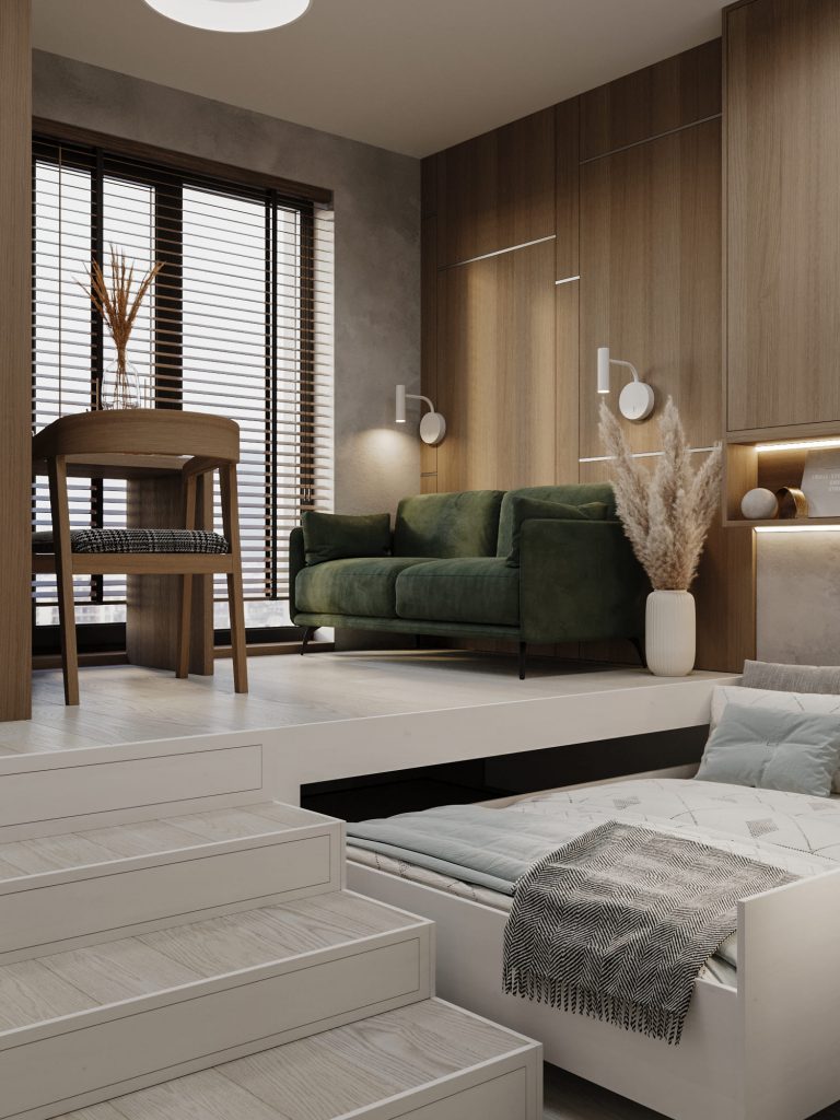 Зона отдыха включает диван глубокого зеленого цвета, расположенный у стены с деревянными панелями и встроенными светильниками, что придает комнате уюта и визуального интереса. Шкафы и стеллажи обеспечивают достаточно места для хранения вещей, сохраняя при этом чистоту и порядок пространства.