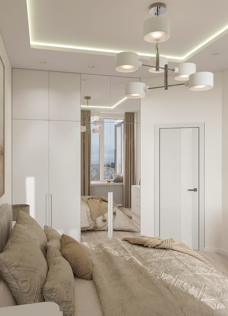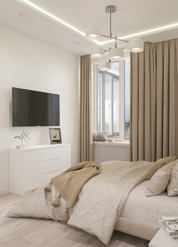 Также разместили на одной из стен гардероб, часть фасадов сделав зеркальными по просьбе заказчицы. Кроме того, дополнительное хранение сделали под ТВ — комод в таком же светлом оттенке.