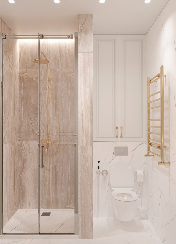 Достаточно один раз взглянуть на санузлы, чтобы понять, какой из них предназначен для главы семьи, а какой — для женской половины. В первом варианте мы использовали отделку керамогранитом темного коричневого цвета и хромированную фурнитуру, а во втором — керамогранит белого и пепельно-розового оттенка с текстурой мрамора в сочетании с благородным золотым оттенком фурнитуры.