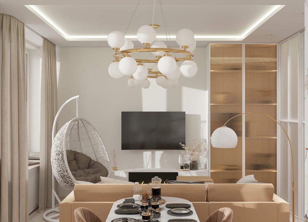 Мы предусмотрели удобное кресло-яйцо и несколько систем хранения разного вида: закрытый распашной шкаф, лаконичную тумбу под ТВ, а также шкаф с дверцами из рельефного стекла с подсветкой.