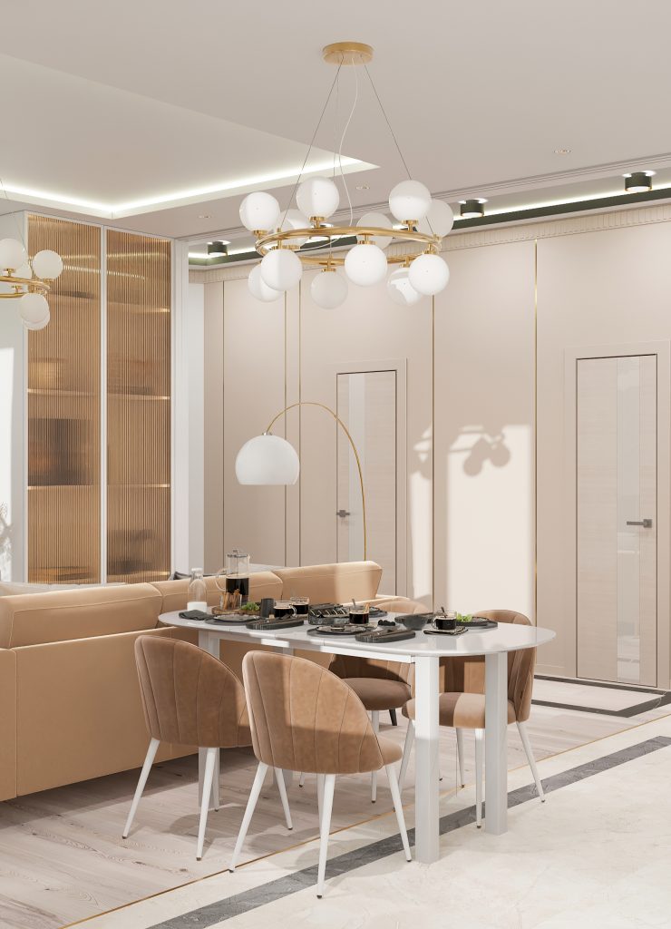 Кухня-гостиная гораздо нежнее прихожей. Тем не менее, и здесь мы сохранили общую стилистику на стыке минимализма, неоклассики и арт-деко. В зоне кухни учли пожелания заказчиков, оборудовав ее большим количеством модулей: часть из них — до потолка, со встроенной техникой. При этом фасады выполнены в белом цвете, что способствует легкости интерьера и соответствует характеру хозяйки, не лишенному перфекционизма и любви к чистоте. Отдельно отметим мраморную текстуру фартука, которая отсылает к роскоши интерьеров начала ХХ века.