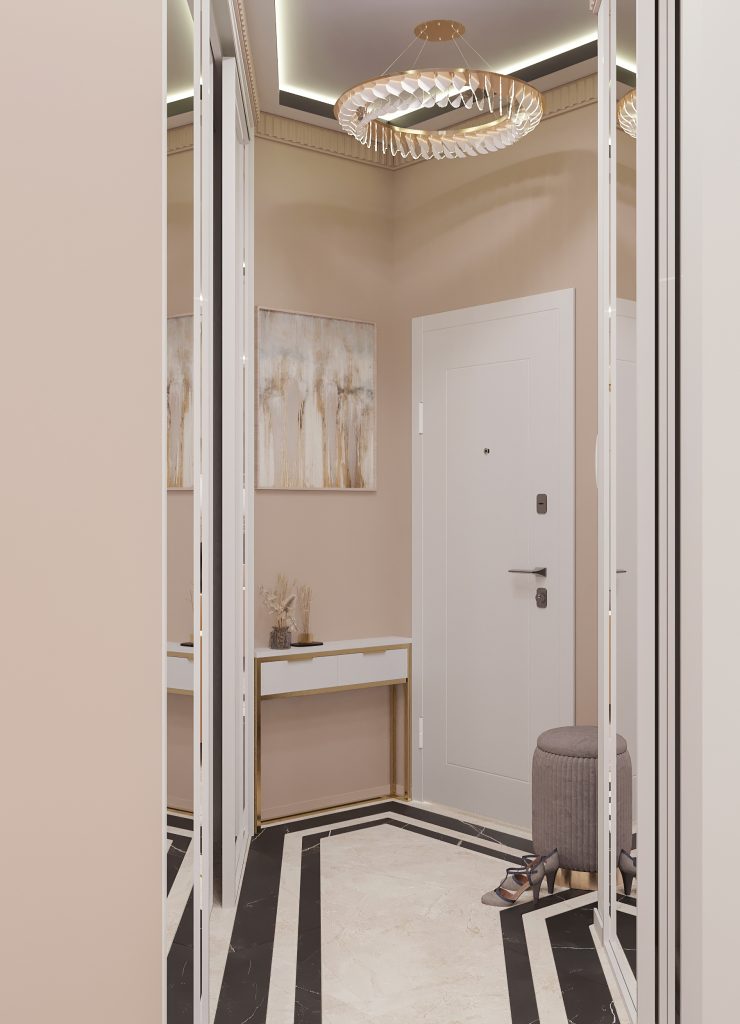 С порога чувствуются отсылки к арт-деко: в рисунке на полу, подчеркивающем геометрию пространства, контрастном выкрасе перепада потолка, а также элементах в золотом цвете. Мы использовали крепления люстры, ножки консоли и настенные крючки в этом оттенке. Кроме того, абстрактная картина на стене дополняет атмосферу цветовой гаммой.