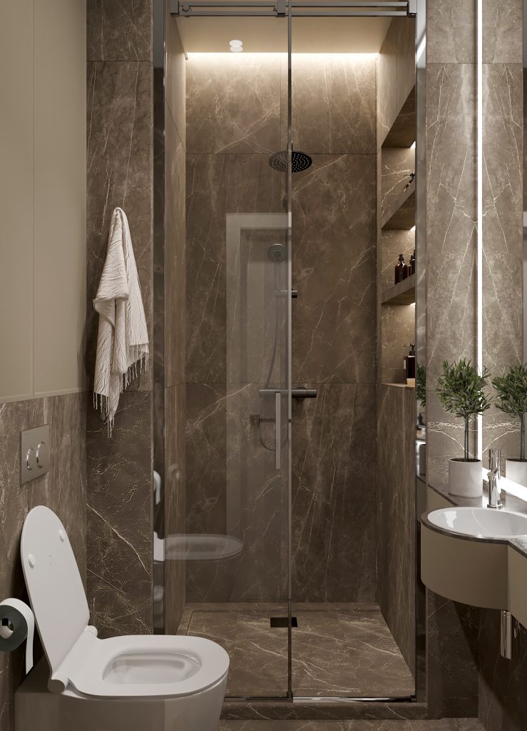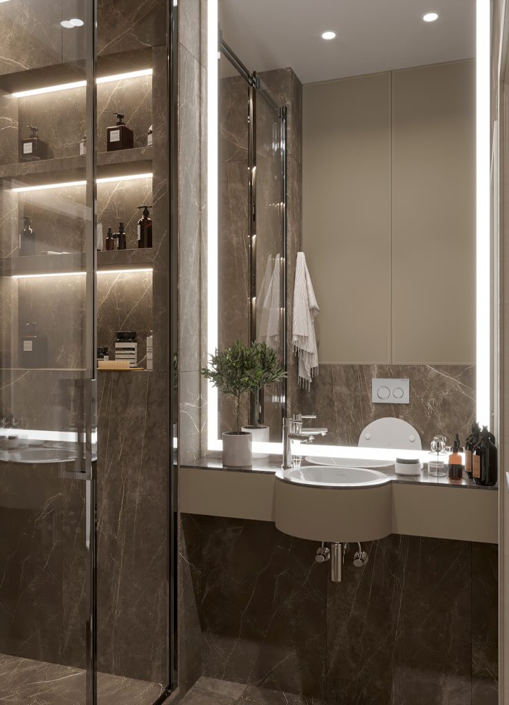 В санузле заказчика, напротив, все более компактно и сдержанно. Здесь мы так же продумали хранение в душевой — полки в нише. Предусмотрели небольшую раковину и зеркало с подсветкой.