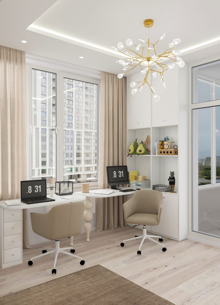 В детской комнате мы продолжили концепцию минималистичной спальни. Предусмотрели два полноценных рабочих места, открытое и закрытое хранение, а также шторы вокруг кроватей — как мобильные перегородки.